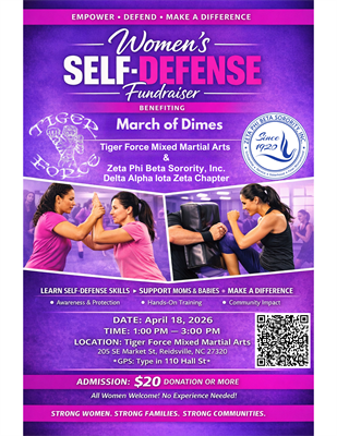 Tiger Force Mixed Martial Arts partnering with Zeta Phi Beta Sorority Inc. Delta Alpha Iota Zeta Chapter is proud to present a Women's Self Defense class fundraiser. Cost $20 donation or more. All proceeds will go to March of Dimes to help improve the health of mothers and babies. Limited spots available
